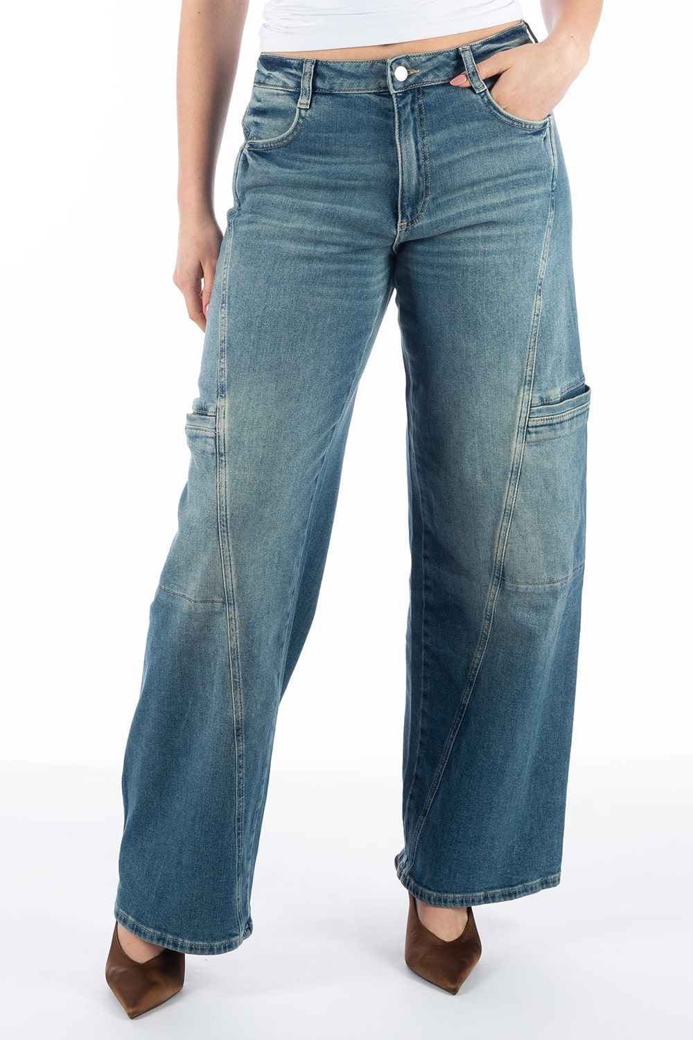 Een ultramoderne wideleg in medium blue met kenmerkende cargozakken aan de zijkant, voor een fashionable twist.