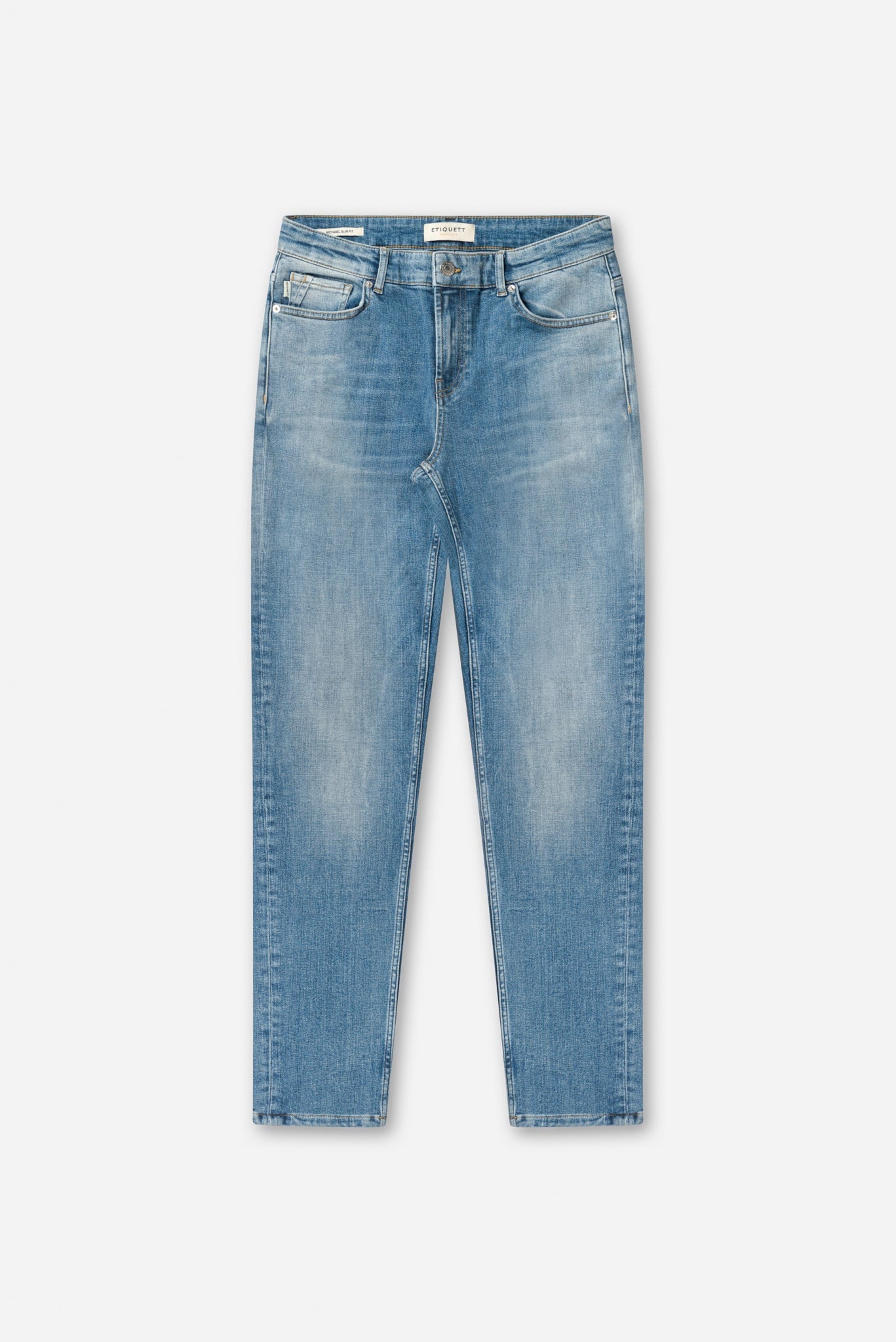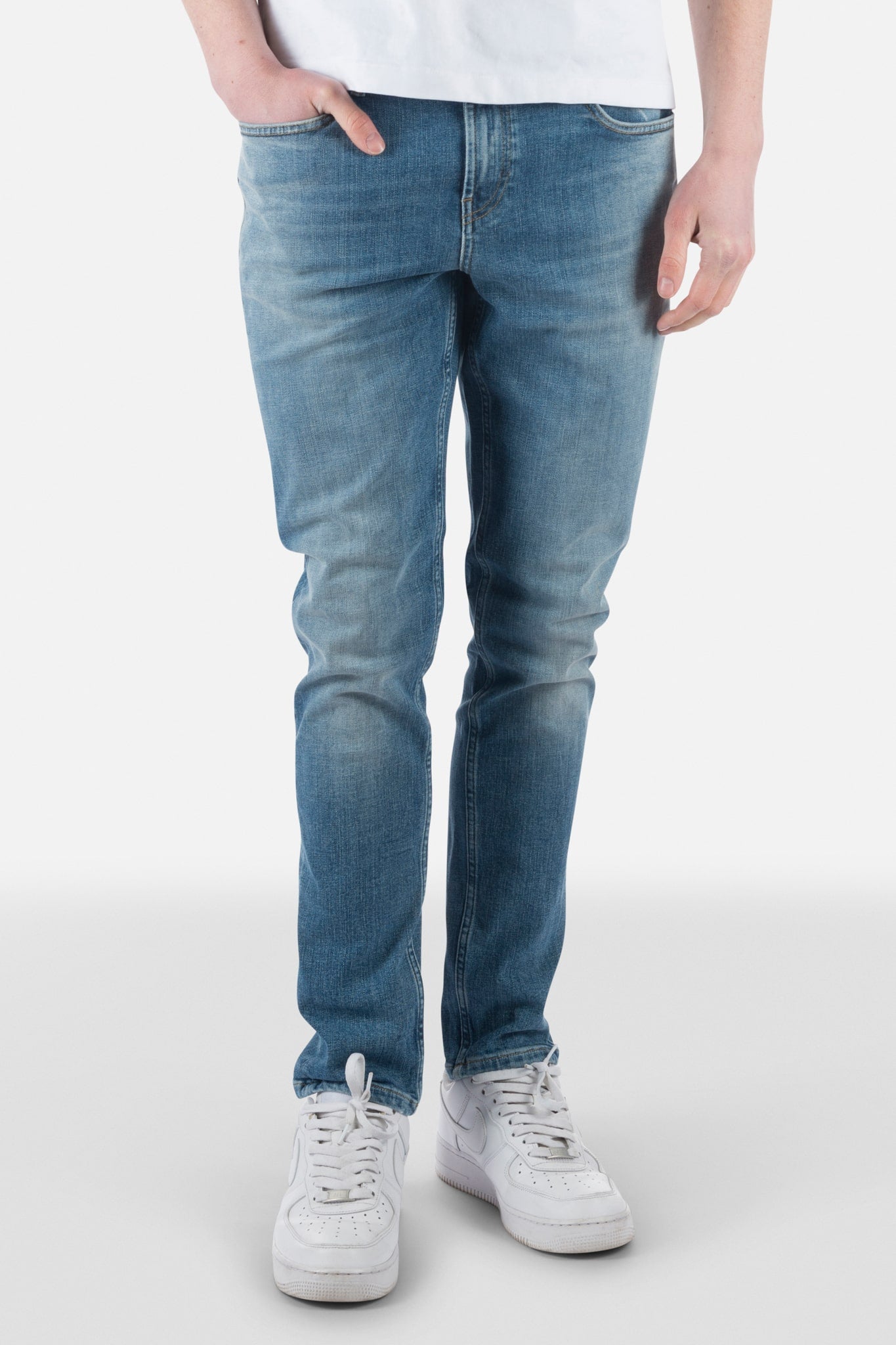 5-pocket style 'Owen' slim fit in strong denim with blue wash and soft color transitions. Featuring recycled cotton and light stretch.