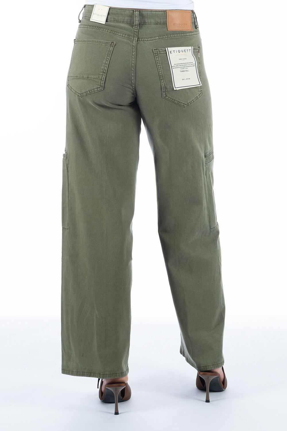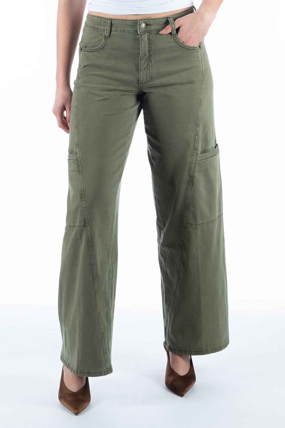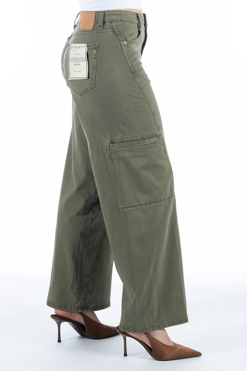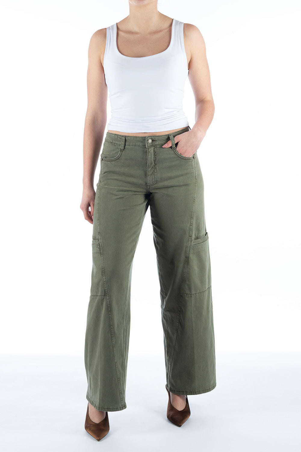 An ultra-modern wideleg in khaki green with signature cargo pockets on the side for a fashionable twist.